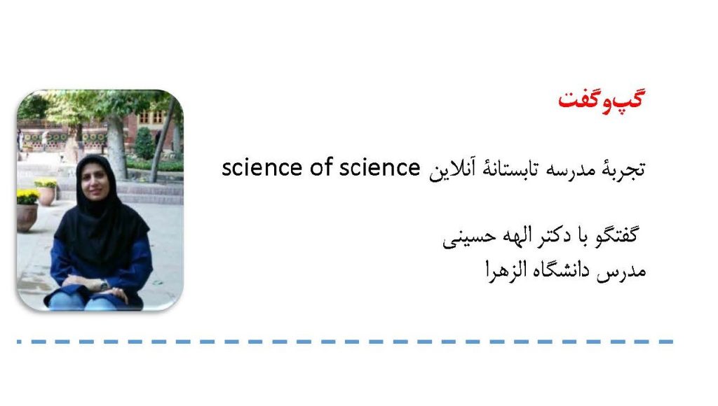 تجربۀ مدرسه تابستانۀ آنلاین Science of Science مصاحبه با الهه حسینی مصاحبهگر: مطهره قادری – سلام و عرض ادب ضمن تشکر از وقتی که به این مصاحبه اختصاص دادید. لطفا این دوره را معرفی فرمایید. – سلام وقت بخیر. من الهه حسینی دانشآموختۀ دکتری و مدرس دانشگاه الزهرا، تصمیم دارم از تجارب خود […]